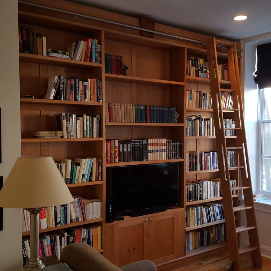 Custom cherry library. Built to fit into a gorgeous condo in old city. From the casework to back panel this piece was built entirely from solid wood, and fits together with tapered sliding dovetails. It could be disassembled, and reassembled in a new location If the need ever arose. It stands 108″ tall, and 144″ long, and features a mahogany keystone, ad well as a rolling ladder.