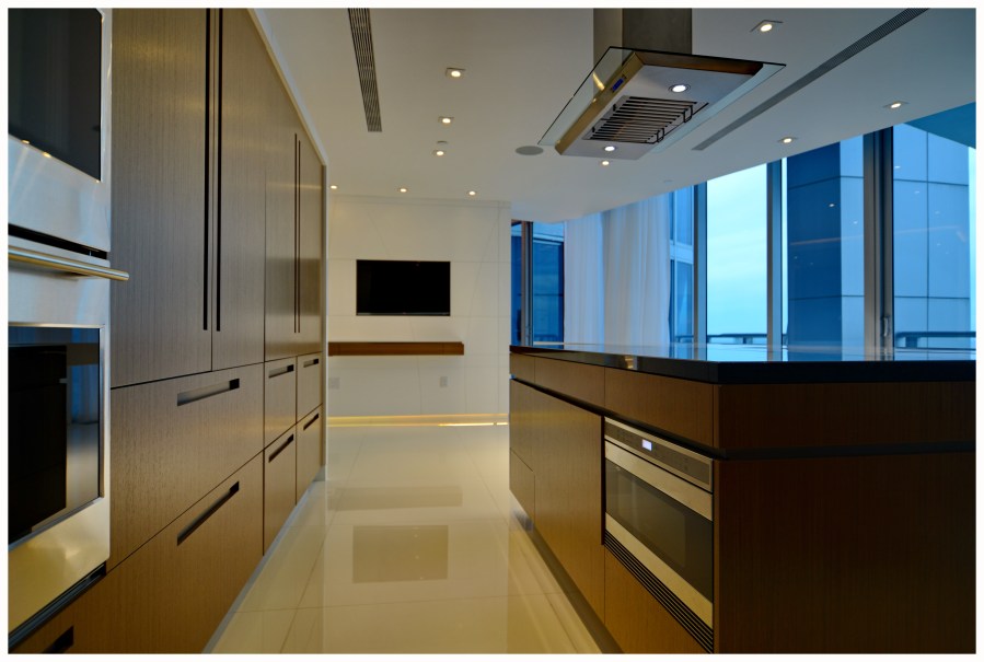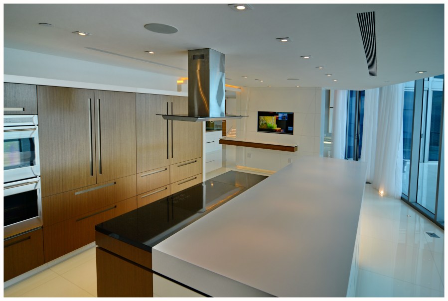 Walnut, and polished white kitchen. This modern Kitchen balances light, and dark, heavy and delicate. Its open plan lets all of the elements breath in their own spaces. The walnut door fronts concealing the appliances feature recessed bronze handles, and the polished white hidden pulls make the design simple yet elegant.